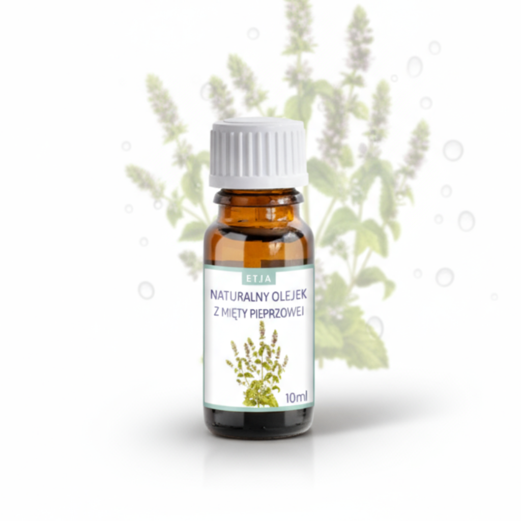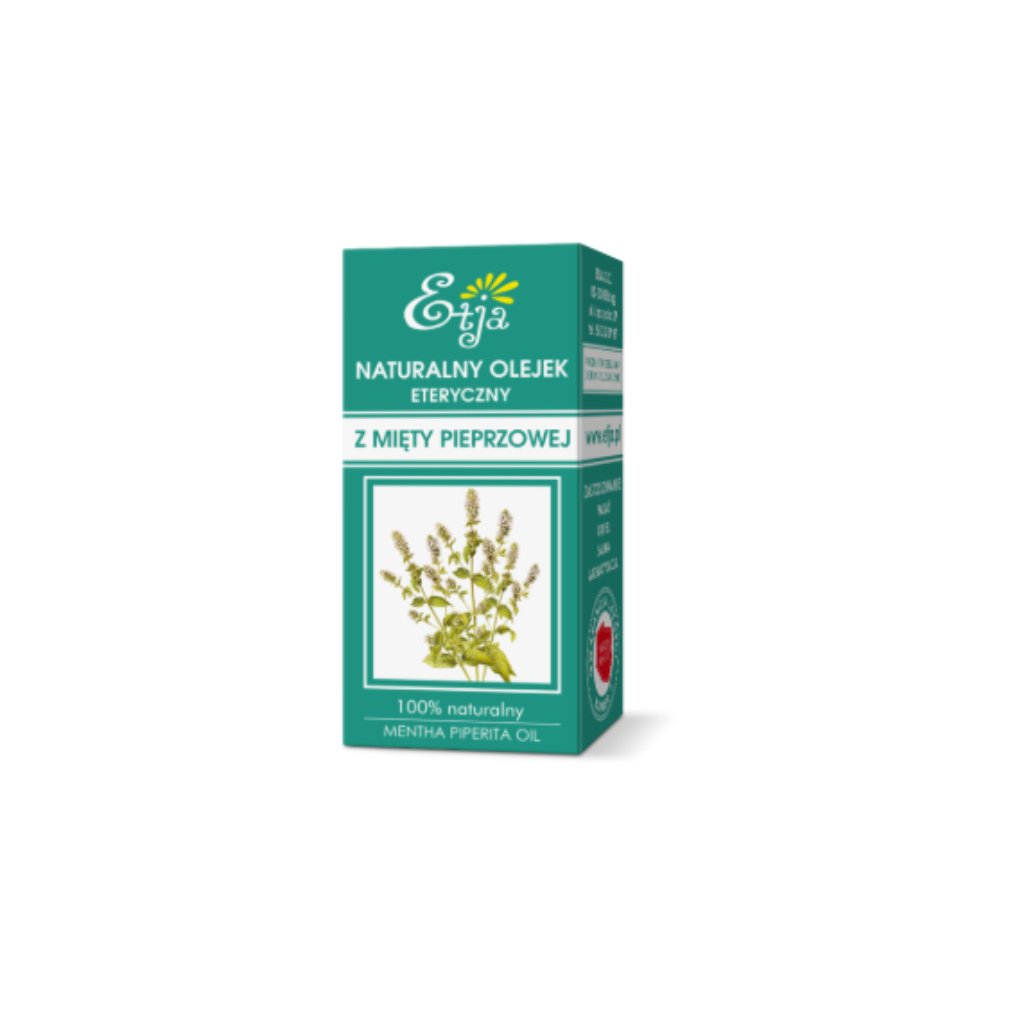 100% naturalny olejek eteryczny miętowy Etja (Mentha Piperita Oil). Działa odświeżająco, antyseptycznie, przeciwbólowo i przeciwzapalnie. Niezastąpiony w aromaterapii, inhalacjach, masażach i pielęgnacji skóry.
