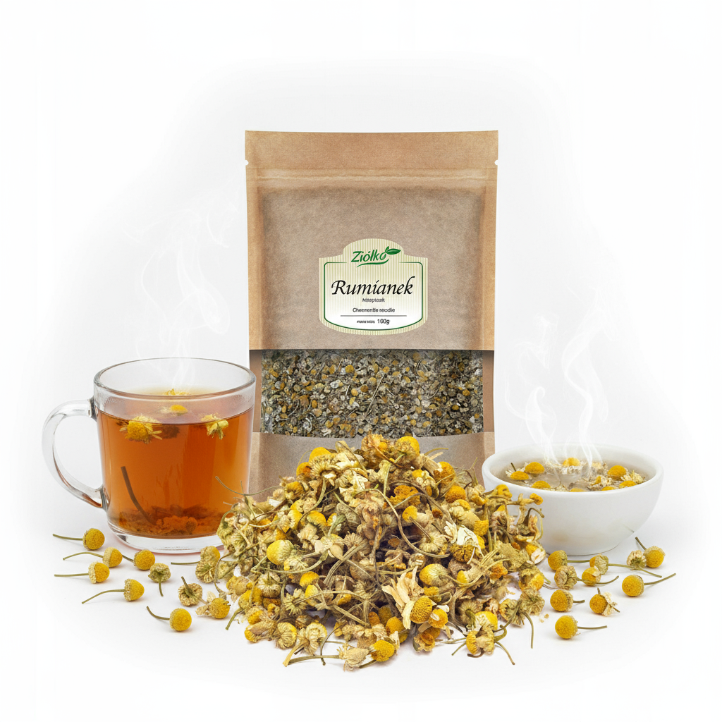 Rumianek koszyczek (Matricaria chamomilla L.) to cenione zioło o łagodnym, kwiatowym aromacie, tradycyjnie stosowane w ziołolecznictwie do wsparcia trawienia, wyciszenia oraz pielęgnacji skóry. Sprawdza się zarówno do naparu do picia, jak i do zastosowań zewnętrznych (płukanki, kąpiele, okłady na skórę/powieki).