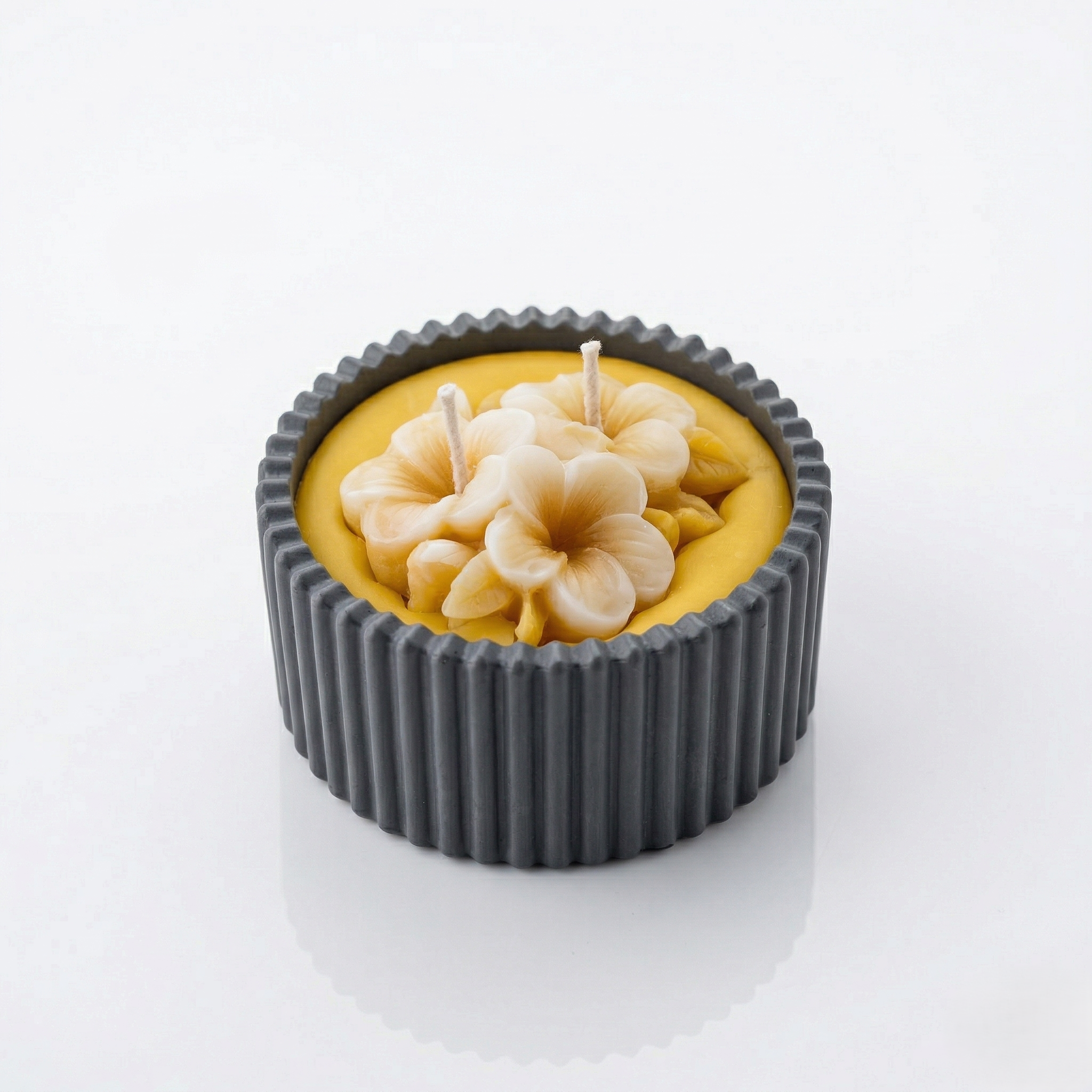 Ciepły, słoneczny odcień wosku pięknie kontrastuje z czarnym naczyniem o subtelnych, pionowych prążkach, które podkreślają jej elegancki charakter. Górę świecy zdobi misterny, trójwymiarowy układ kwiatów, tworzący wyjątkowy efekt wizualny – szczególnie po zapaleniu dwóch knotów, gdy światło płomienia delikatnie ożywia całą kompozycję.